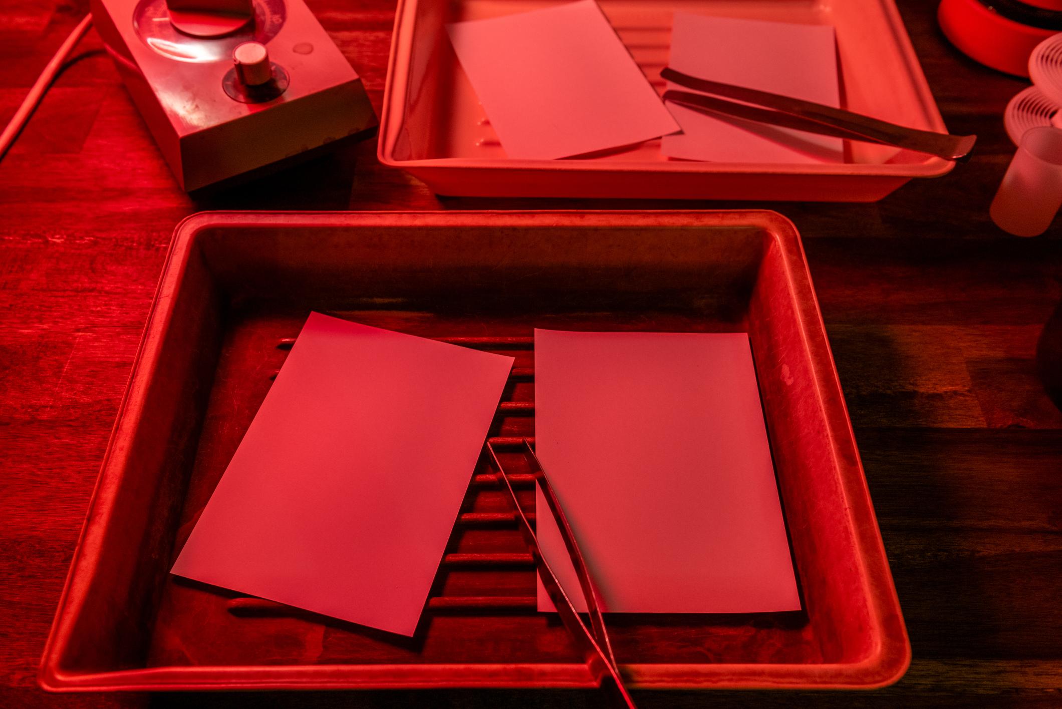 Una vez hecha la exposición en la prensa, es necesario que se vuelva a cubrir ésta con el cartón, y llevarla de nuevo a la mesa donde están las cubetas. Retire de la prensa el papel impresionado e introdúzcalo en el revelador con la cara brillante hacia arriba, teniendo cuidado de que no queden burbujas de aire en su superficie para luego balancear lentamente la cubeta de modo que el líquido esté siempre en movimiento. La cubeta puede permanecer descubierta, a condición de que esté en la sombra proyectada por usted. En los primeros momentos, el papel seguirá siendo tan blanco como cuando salió de la caja. Pero pronto empieza a aparecer la foto positiva, débilmente al principio, y con mayor vigor a cada segundo que pasa. Y es realmente impresionante el ir viendo surgir detalles en aquella superficie donde nada percibimos. No espere conseguir resultados perfectos en su primera operación de positivado. Puede ocurrir que la prueba salga demasiado oscura, o hasta enteramente negra. Esto le diría que la exposición do menos tiempo a la acción de la luz la segunda hoja de papel que exponga. Si al contrario, la imagen aparece con exagerada lentitud al de acción del revelador, querrá decir que la exposición a la luz al poner la prensa a la misma distancia de la luz que antes pero durante más tiempo decidir el valor de este Pronto aprenderá, por experiencia, a único factor variable, o sea el tiempo de exposición a la luz para producir buenas fotos.