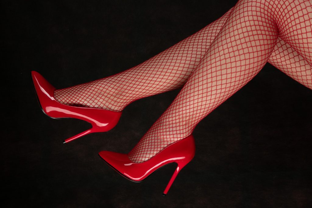 Dos piernas cruzadas con mallas rojas. Una imagen bien compuesta, que indudablemente posee cierto erotismo.