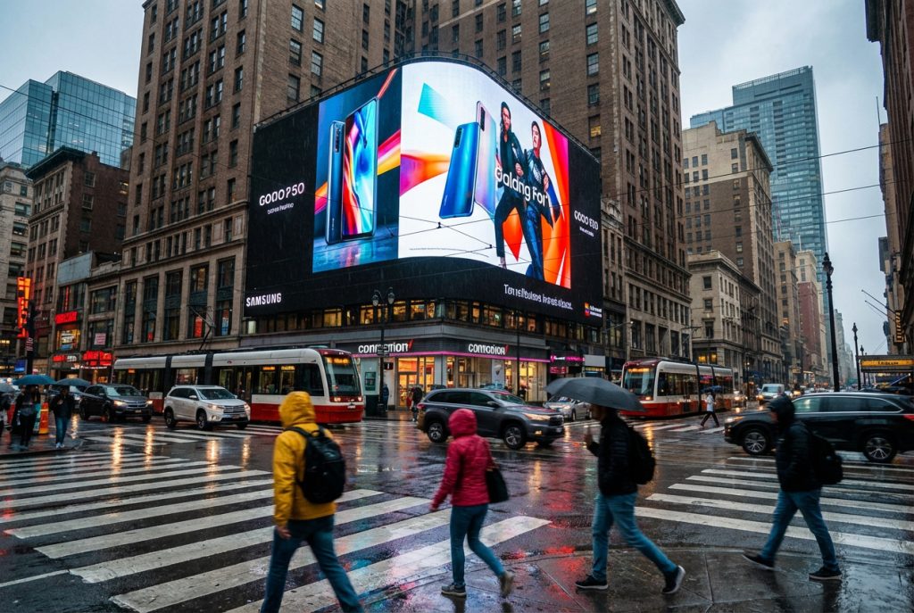 Un enorme cartel publicitario y personas que caminan apresuradamente debajo de él. Un hombre con su dromedario al pie de la gran pirámide tiene dimensión humana, pero esta gente tan anónima a los pies del gigante efímero casi parece formar parte de una población de robots y, en la imagen, su papel es de simples comparsas. Así es la vida en la gran ciudad: una enajenación diaria que se ha convertido en costumbre; la bella imagen puede hacernos reflexionar al respecto.