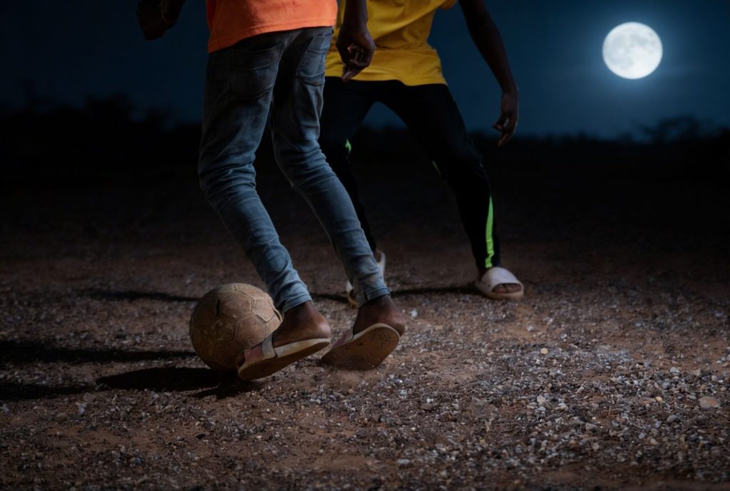 Dos muchachos negros juegan al fútbol en un patio raquítico, infernal, entre los grandes rascacielos de un entorno extraño, que denota marginación y tristeza. La noche recalca la sensación de desolación que transmite la imagen.
