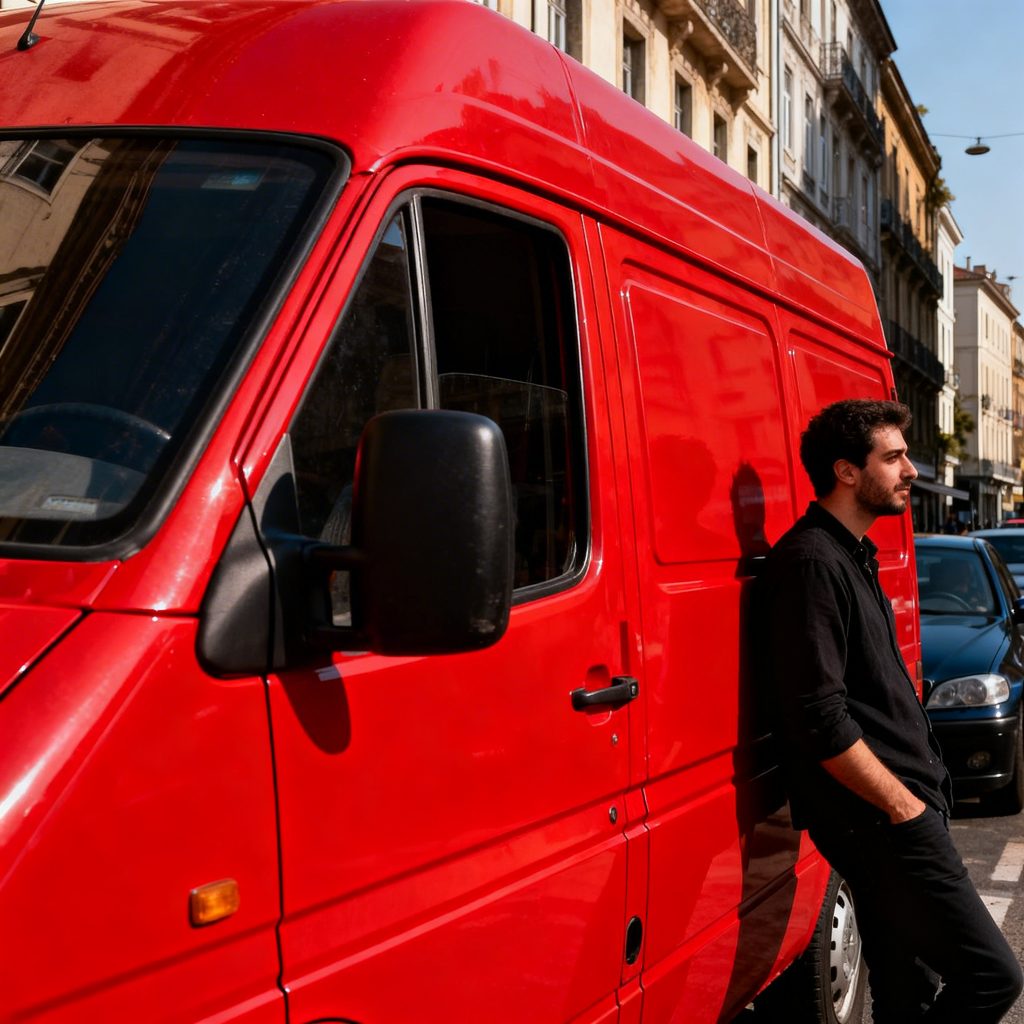 Una escena corriente en una calle. Sin embargo, la foto tiene su aquel gracias al color tan vivo del furgón. ¿Entonces, el protagonista es el rojo intenso de la carrocería? No sólo eso. Si borraremos al hombre nos bardeado sin imagen, sólo nos daremos cuenta de que nos hemos con un rótulo publicitario en una gran mancha roja. Aunque a la presencia del hombre.