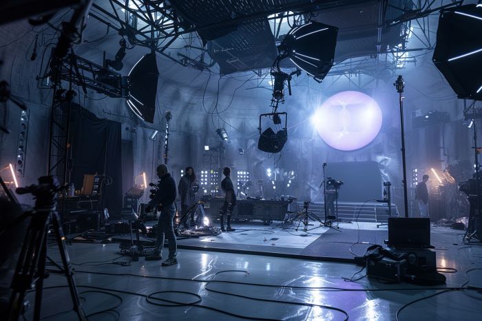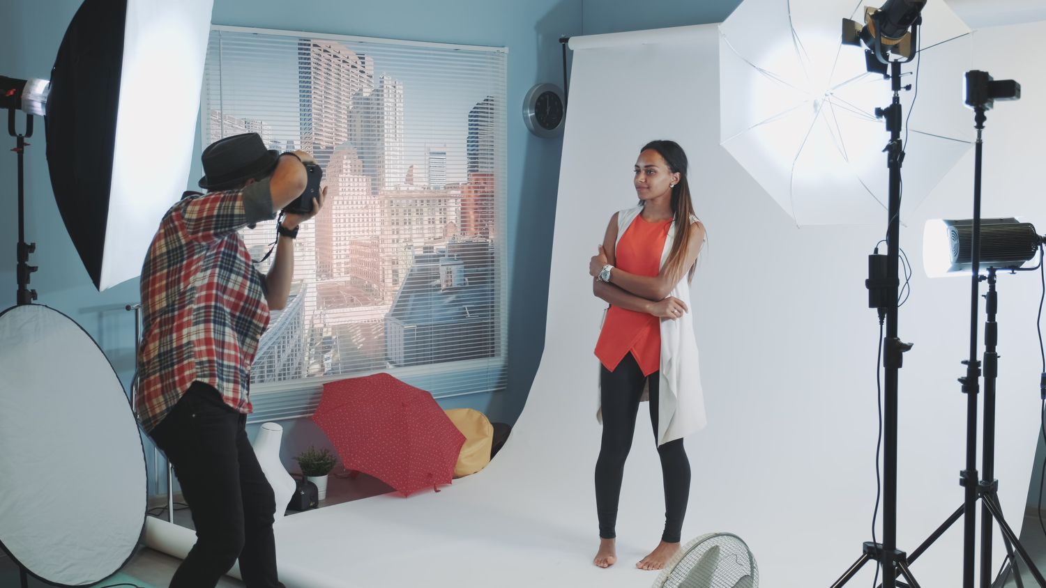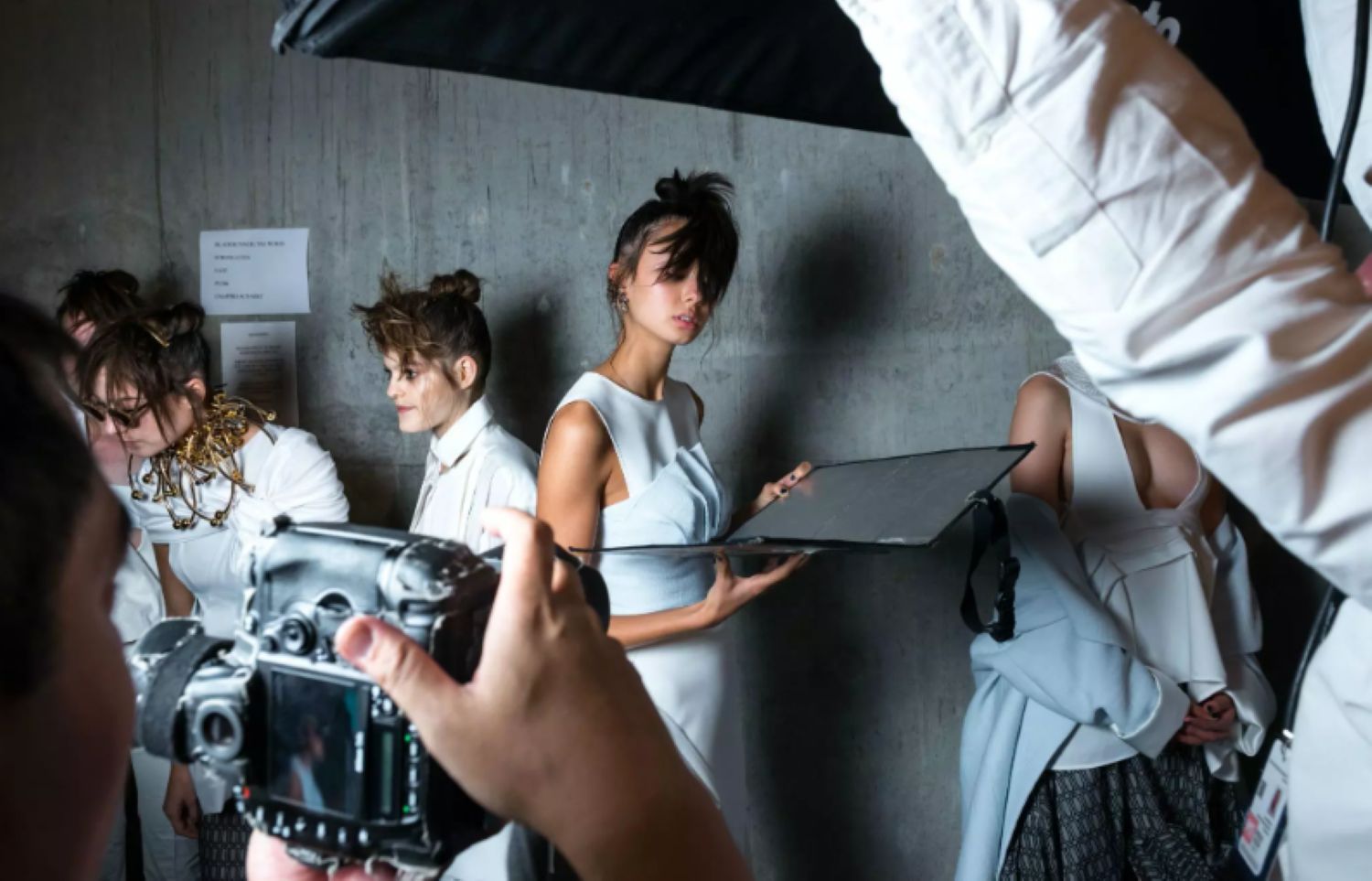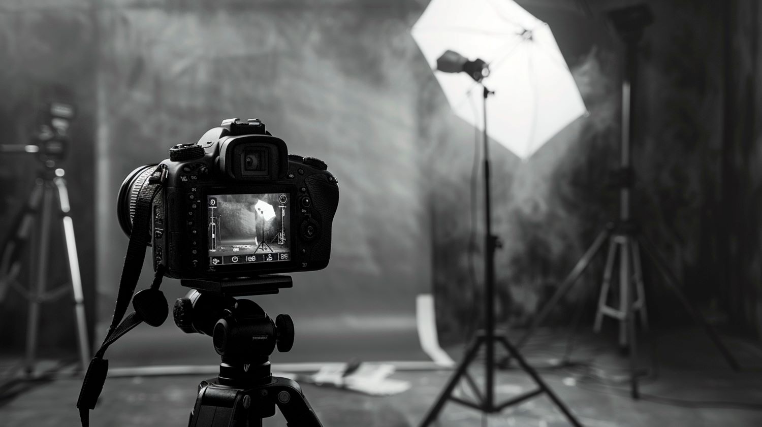 Professional photographer setting the camera while studio shooting session. Backstage of photoshoot