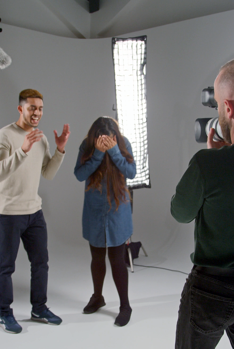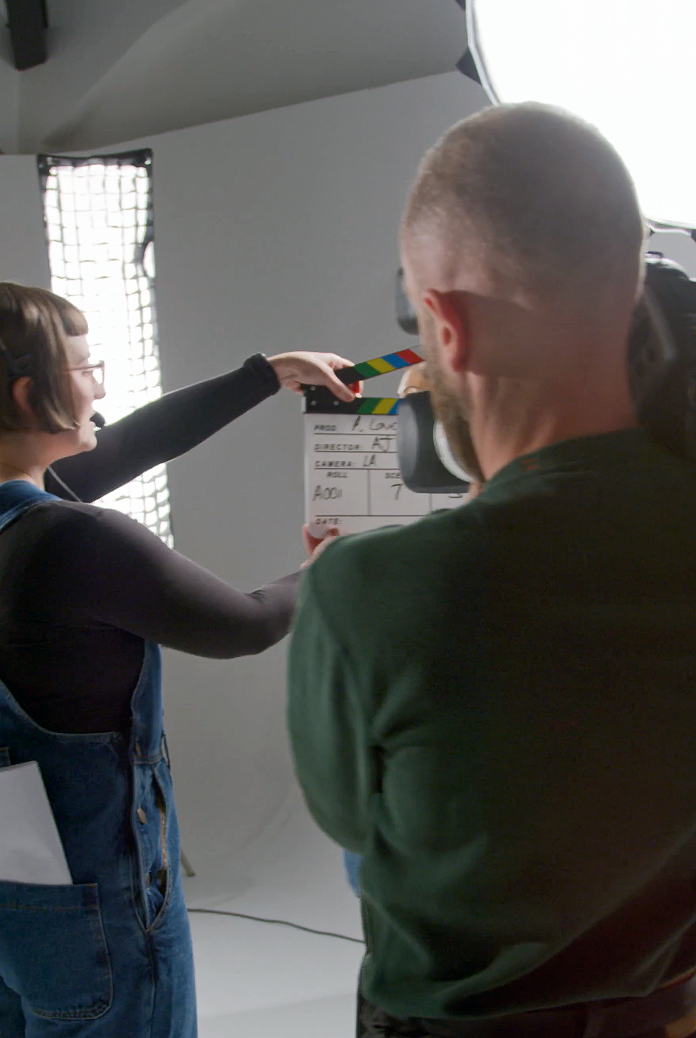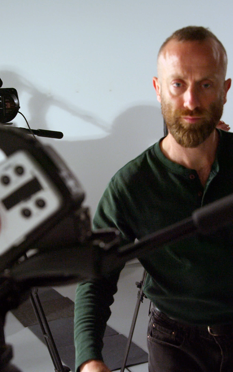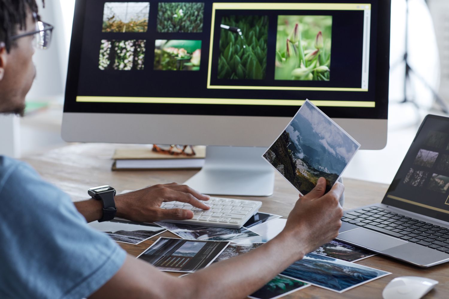 Professional photographer setting the camera while studio shooting session. Backstage of photoshoot