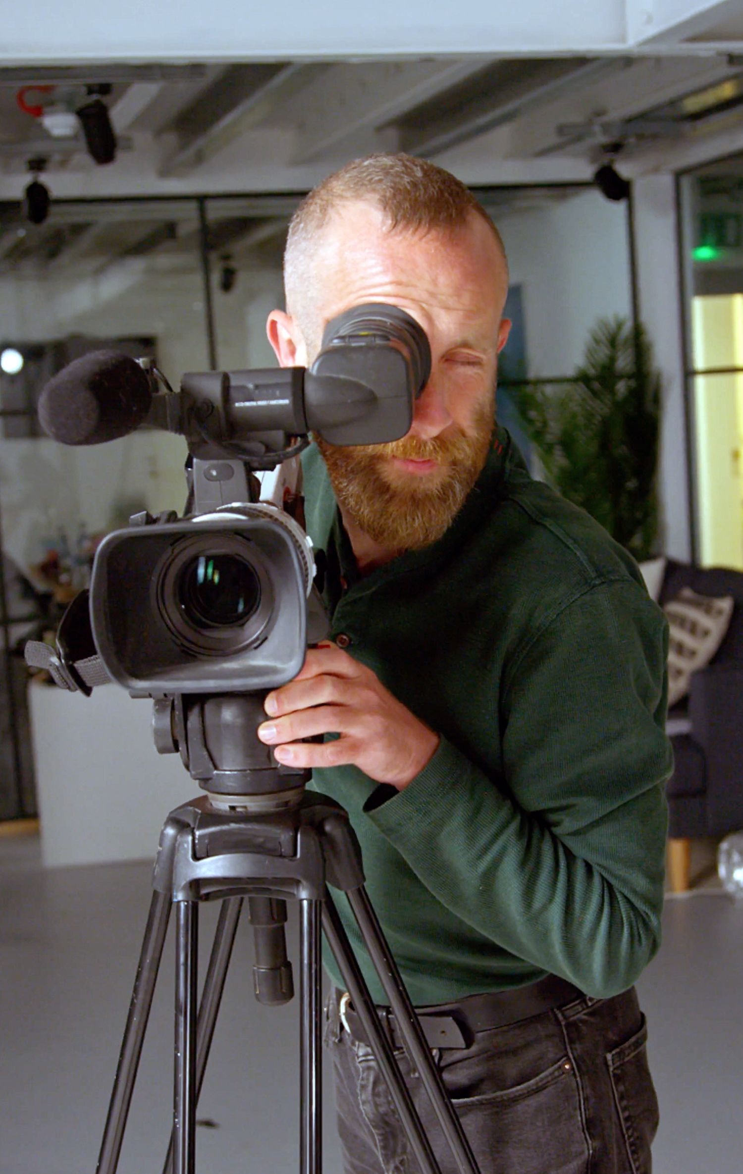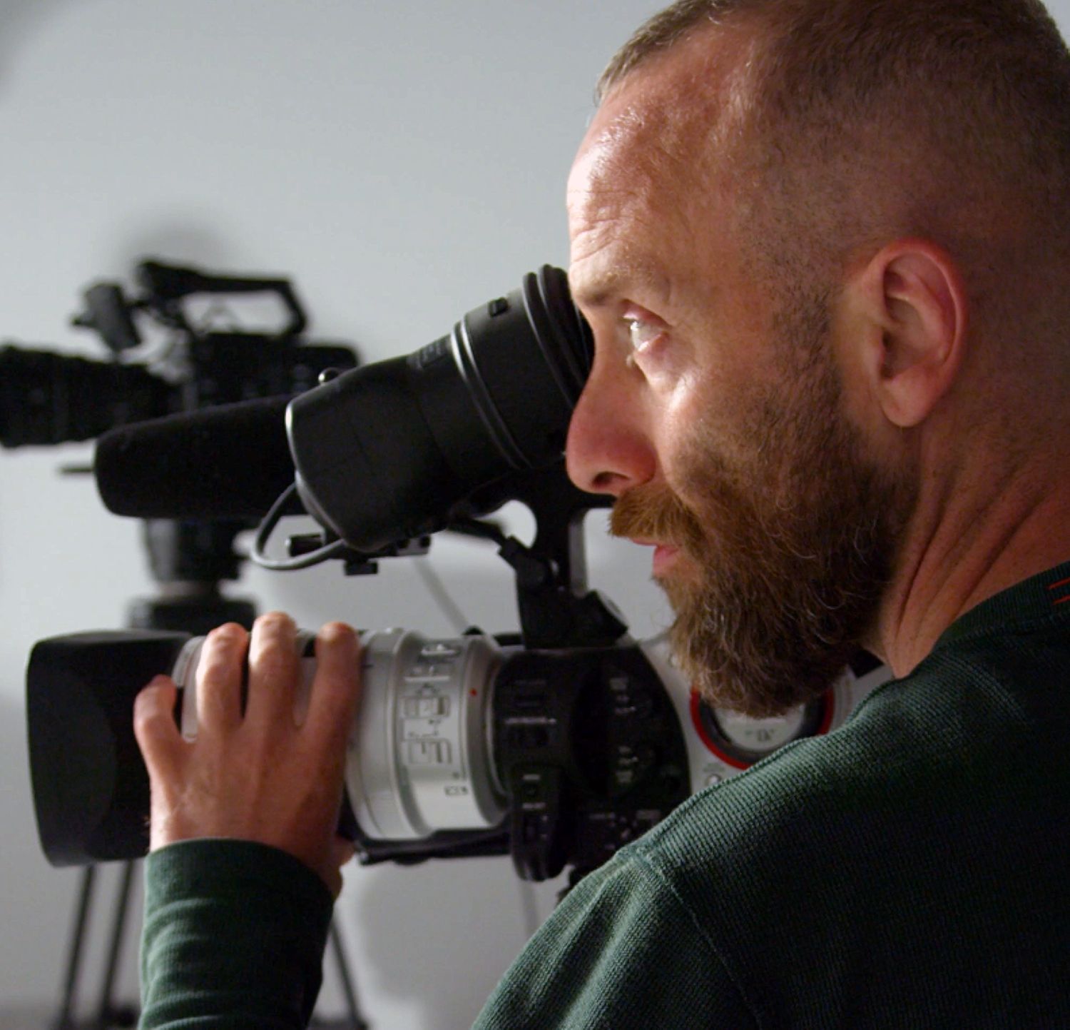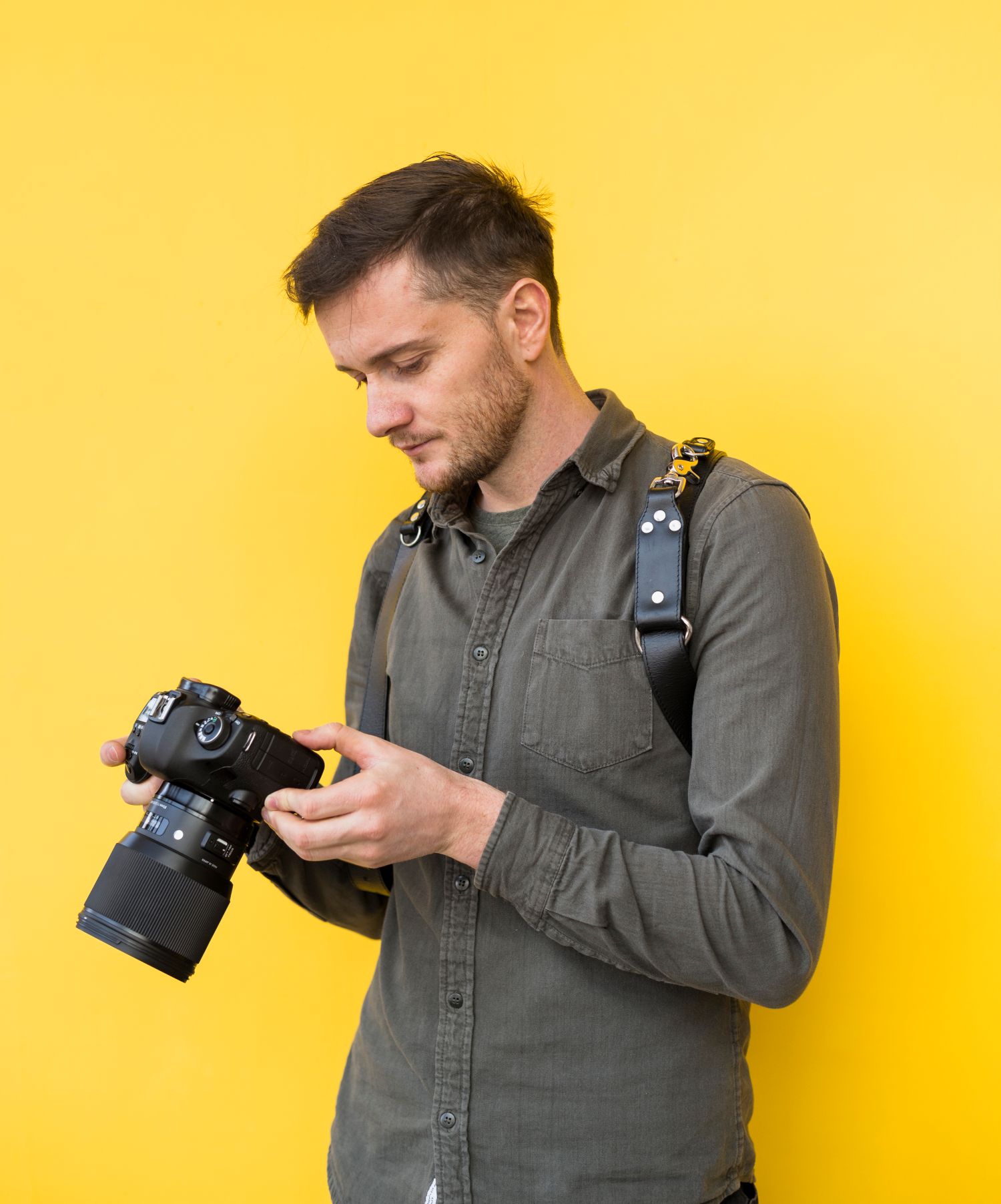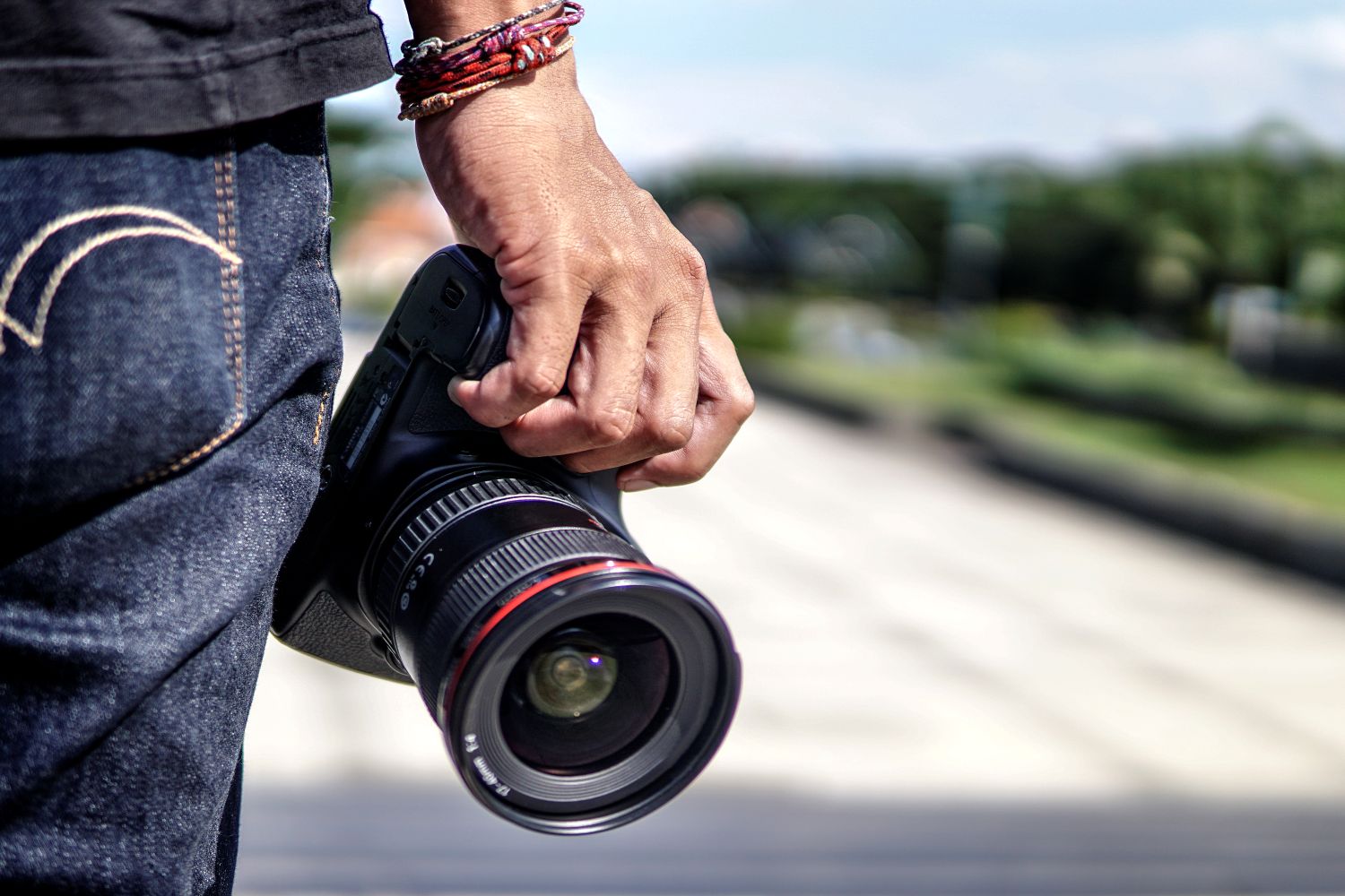 Mirthful photographer holding a camera and looking into the distance with a smile