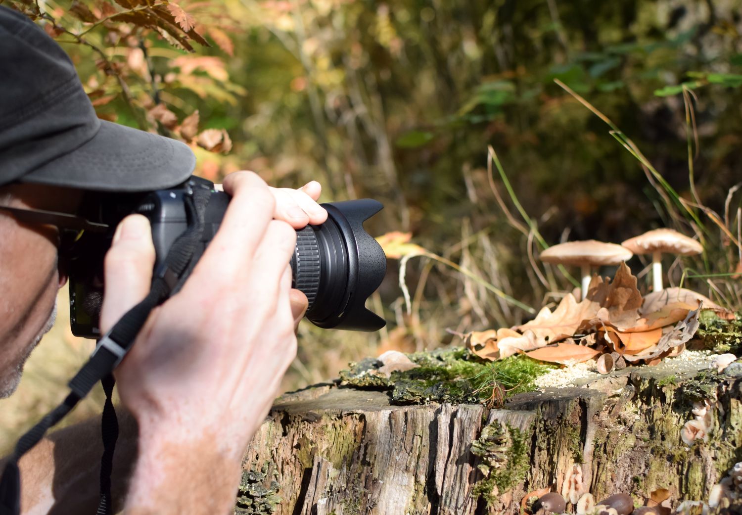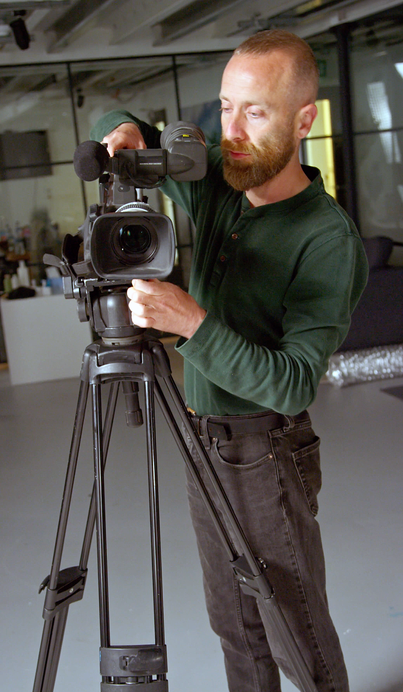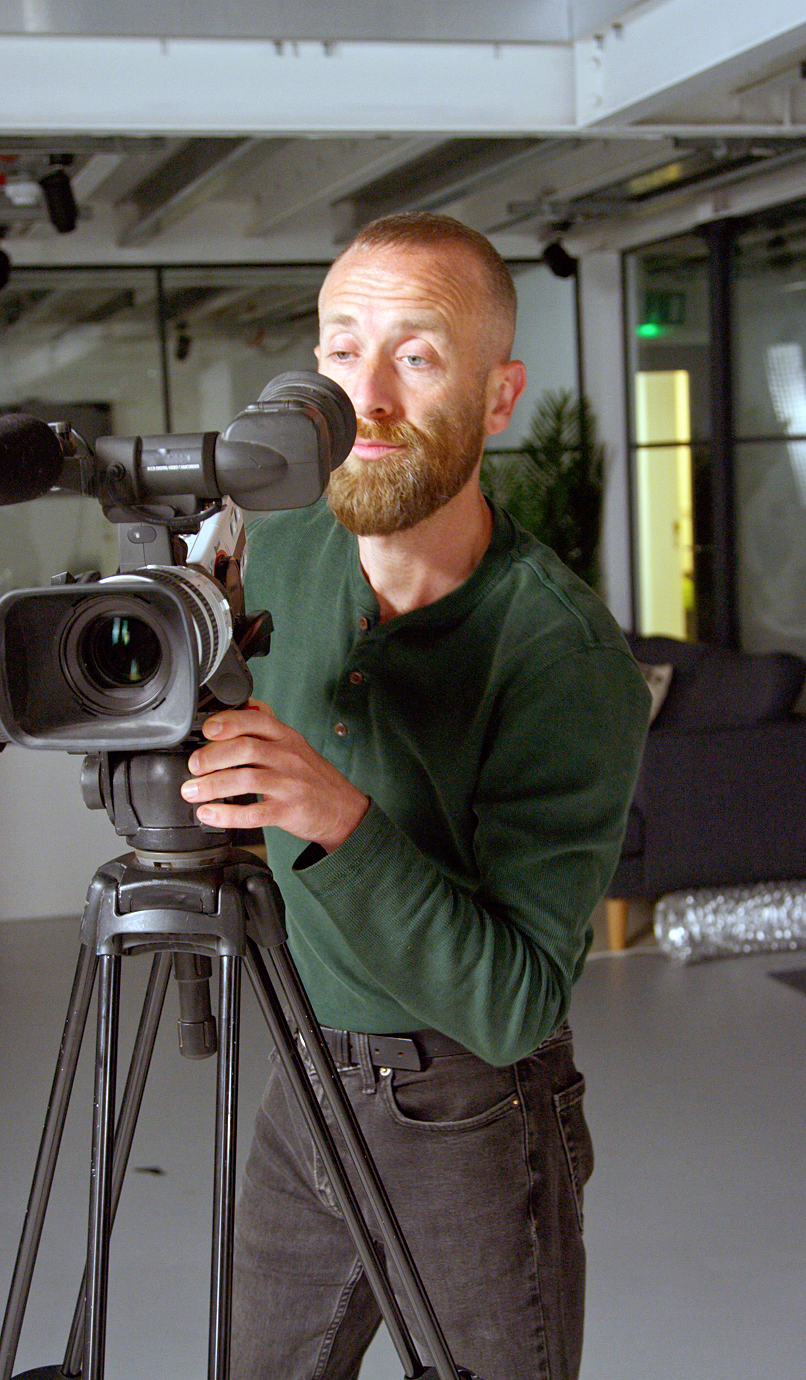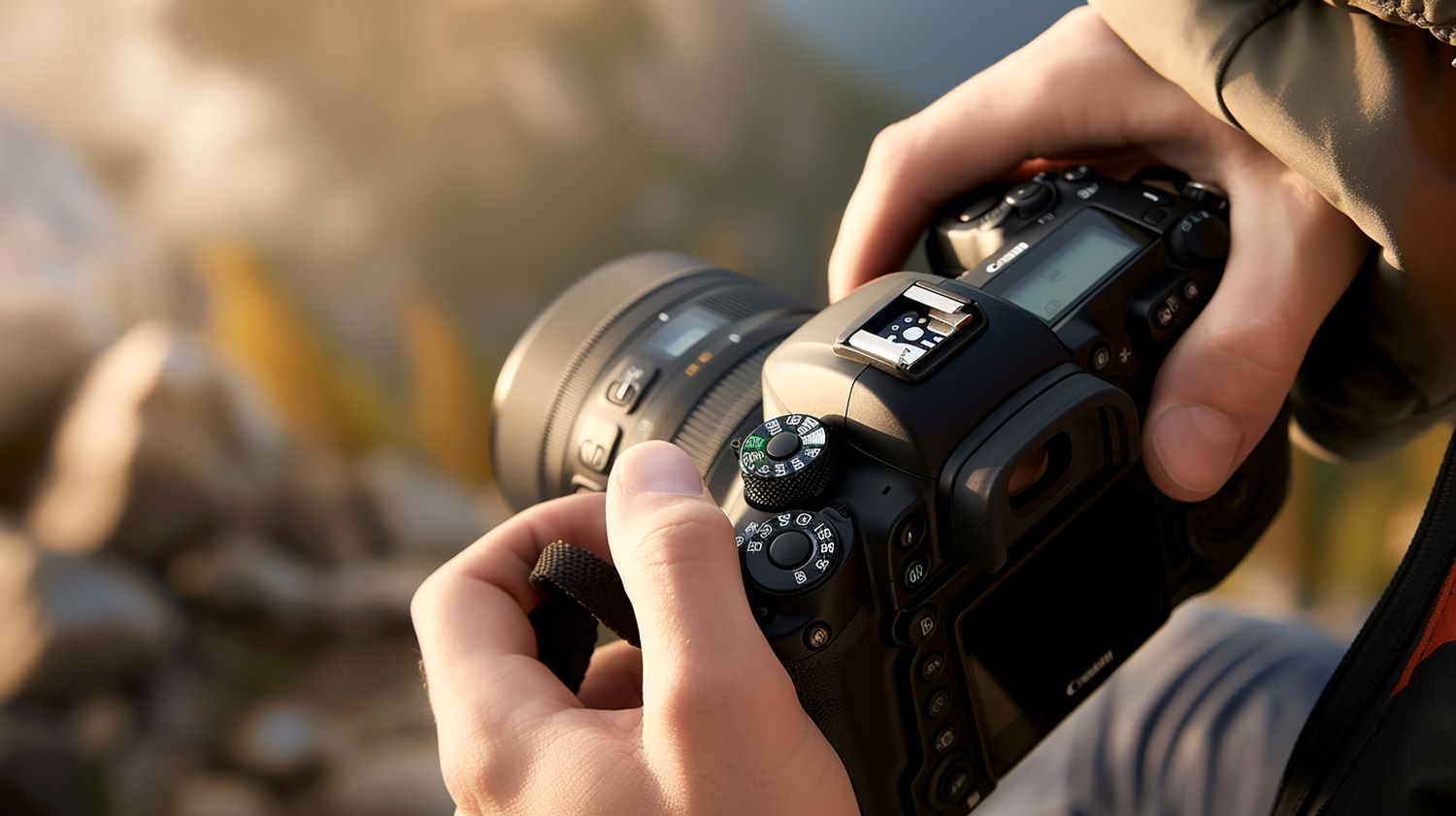 Mirthful photographer holding a camera and looking into the distance with a smile